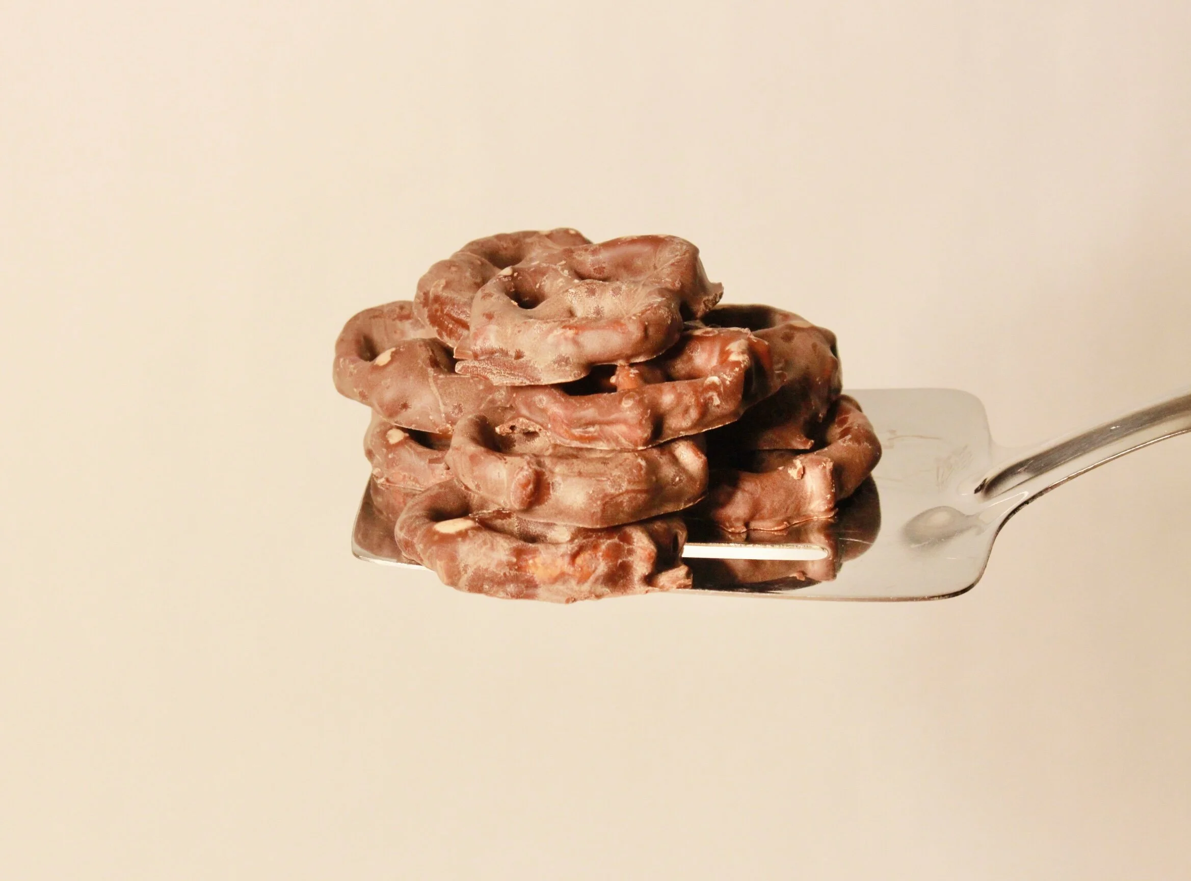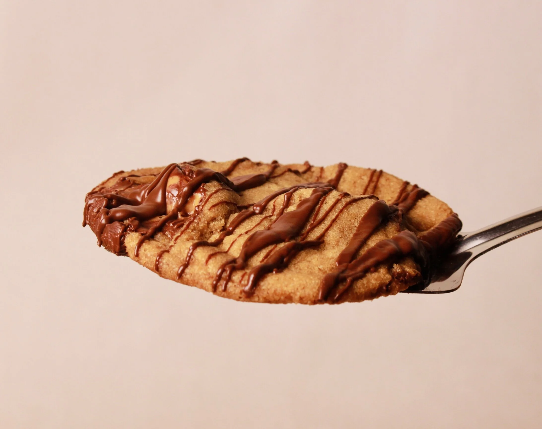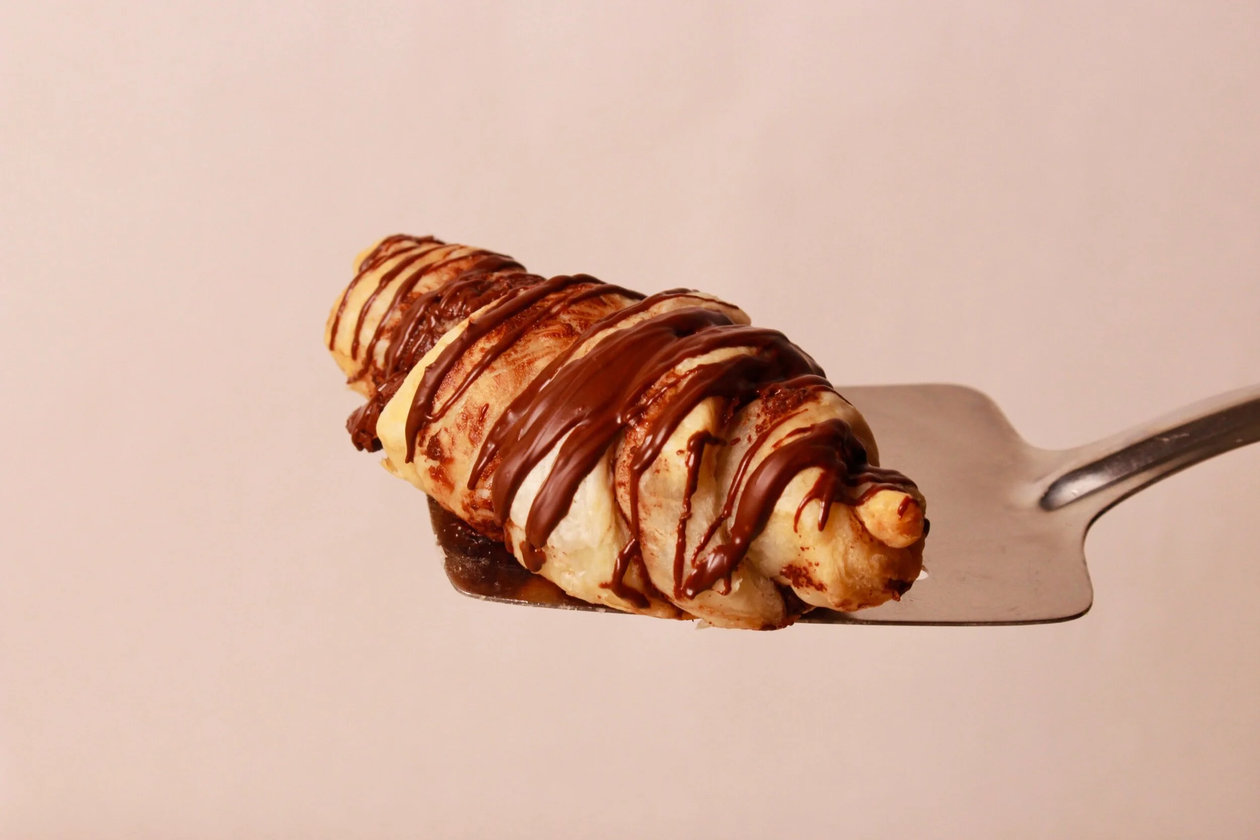melted chocolate on buttered puff pastry all rolled together with chocolate drizzled on top