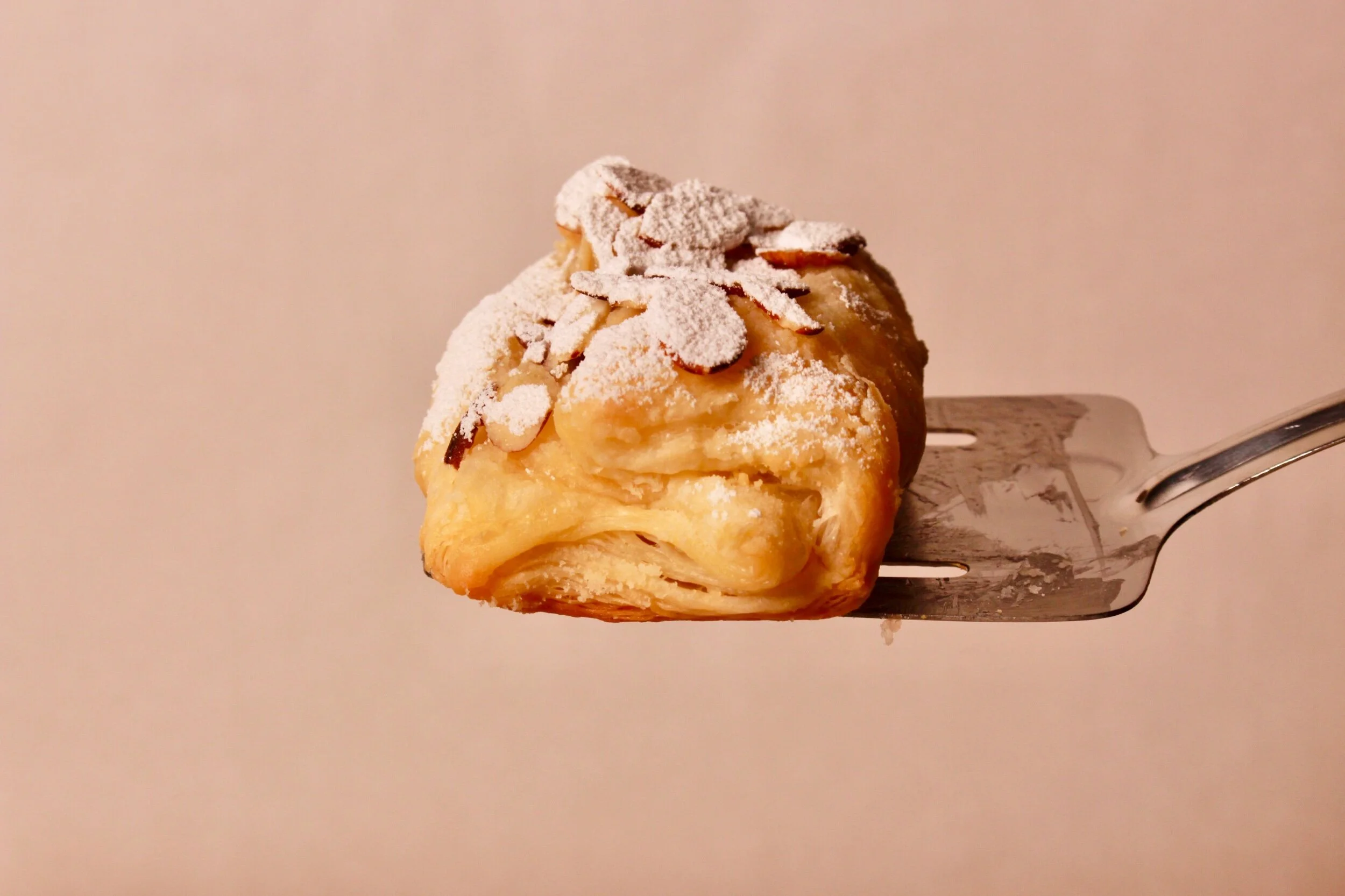 almond filled buttered puff pastry topped with toasted almonds and powdered sugar