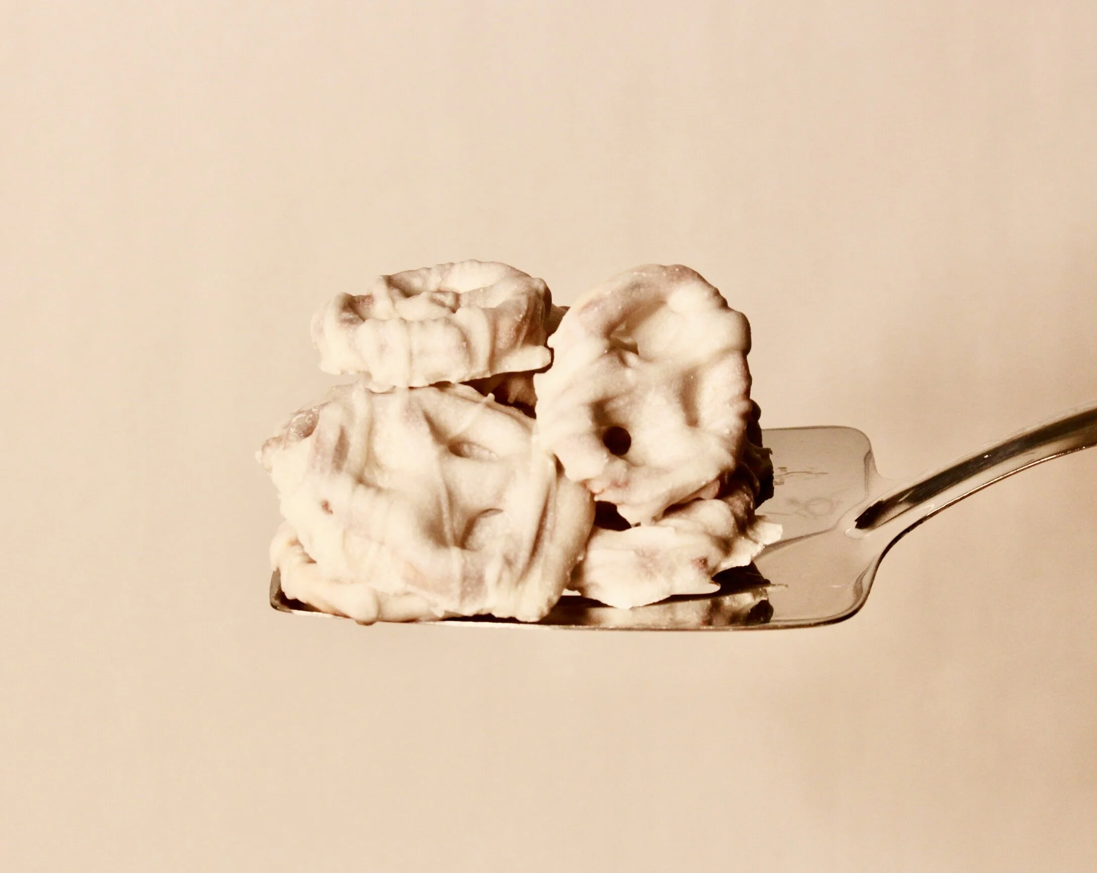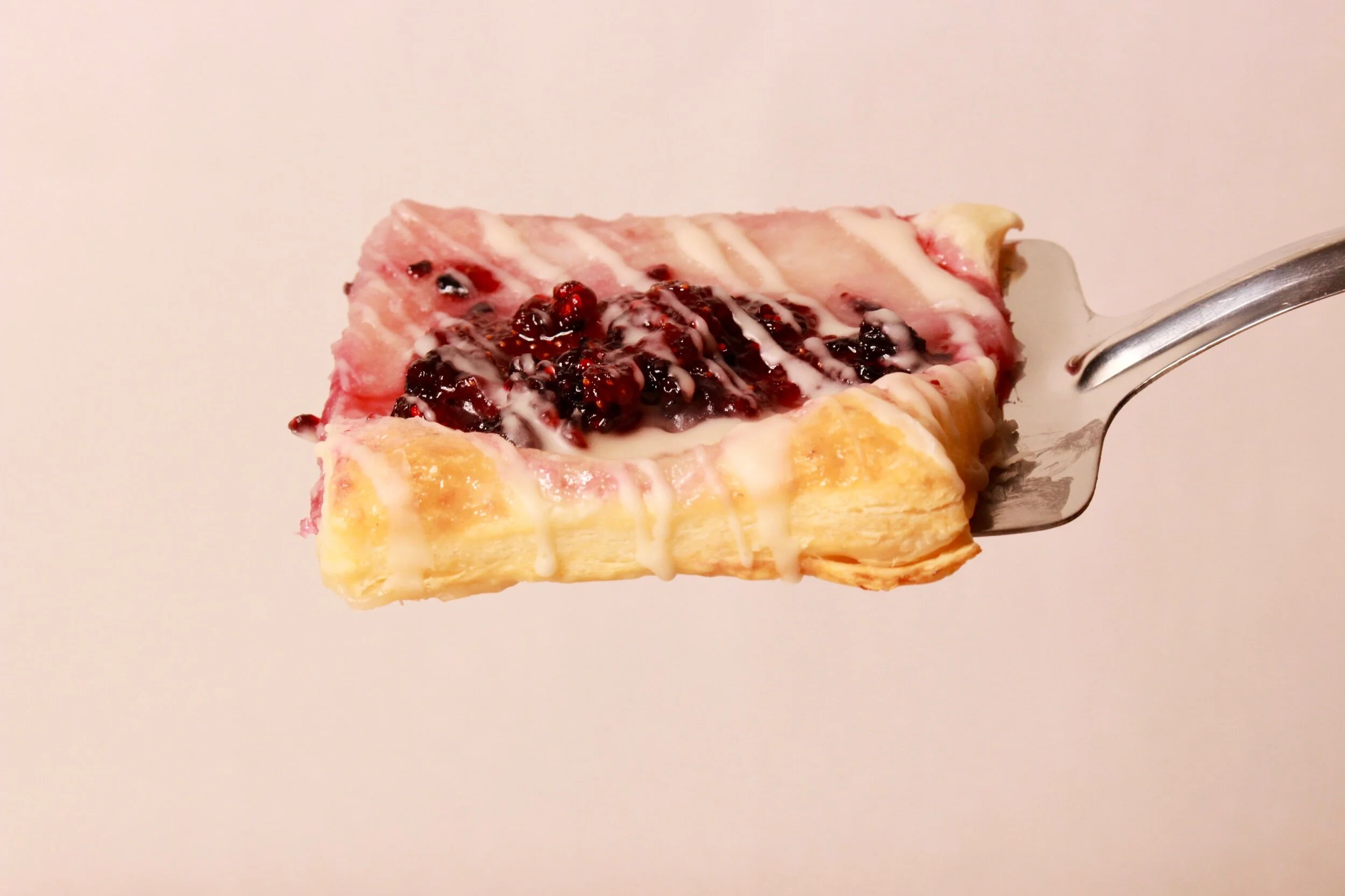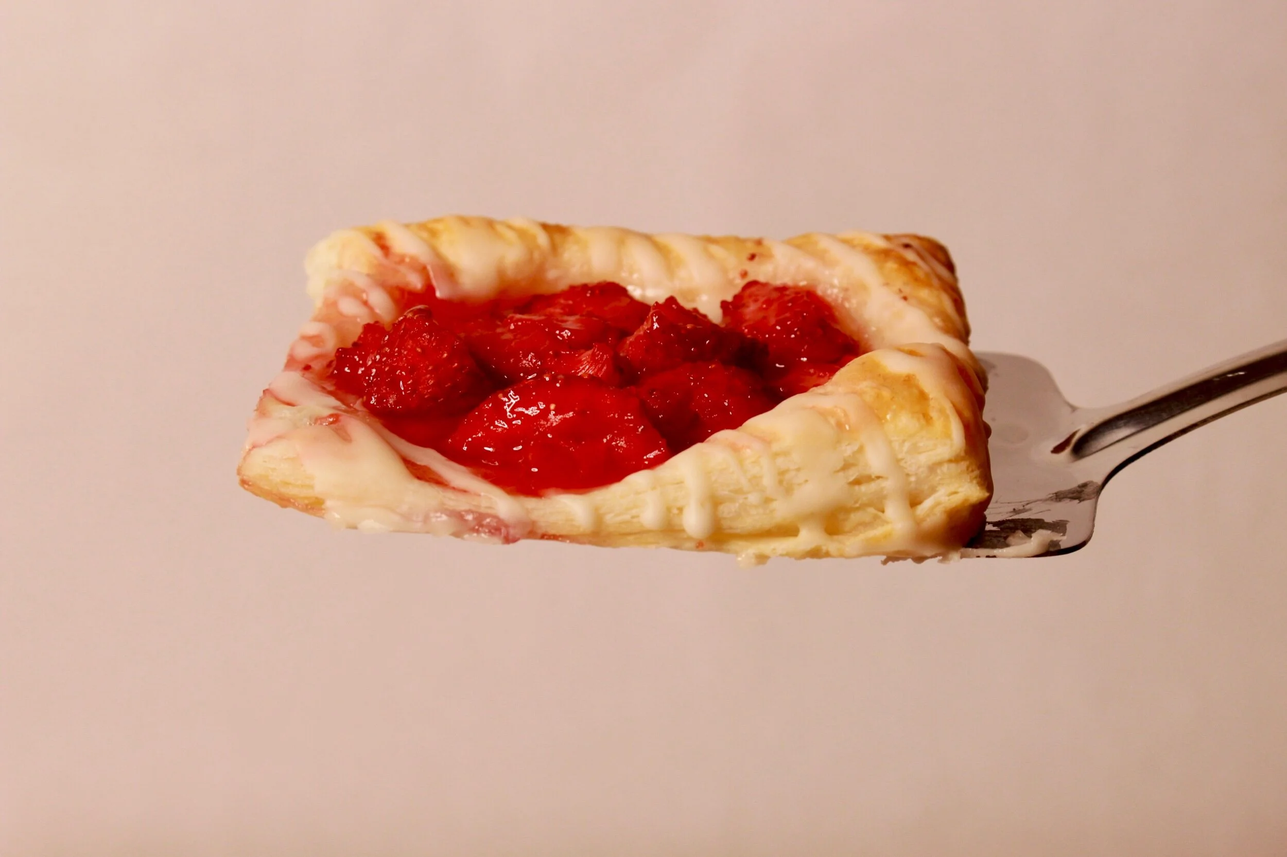 strawberries diced and sugar coated on buttered puff pastry with drizzled icing