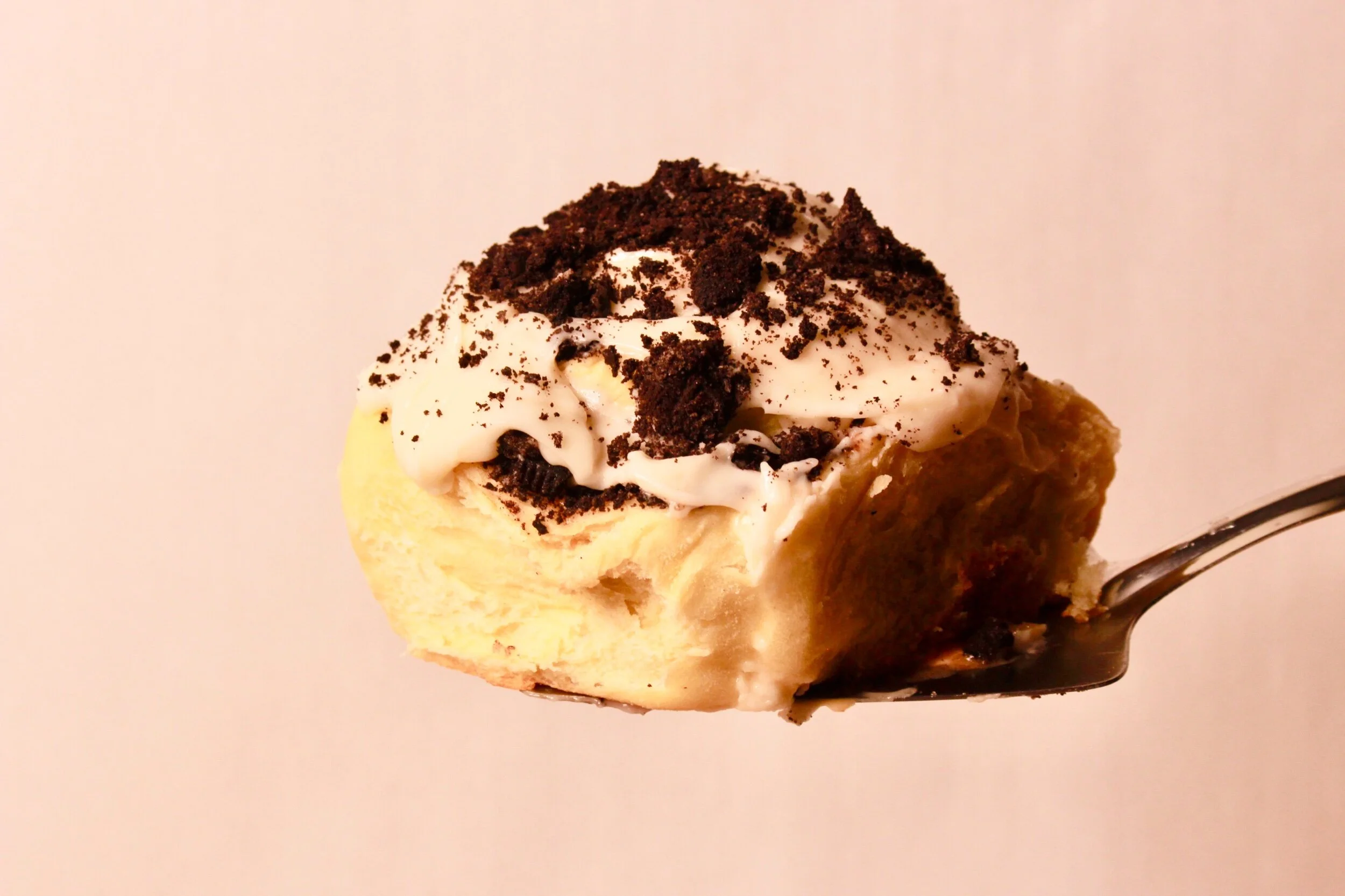 sweet roll made from scratch with cookies and cream filing topped with cream cheese icing and chocolate cookie dusting