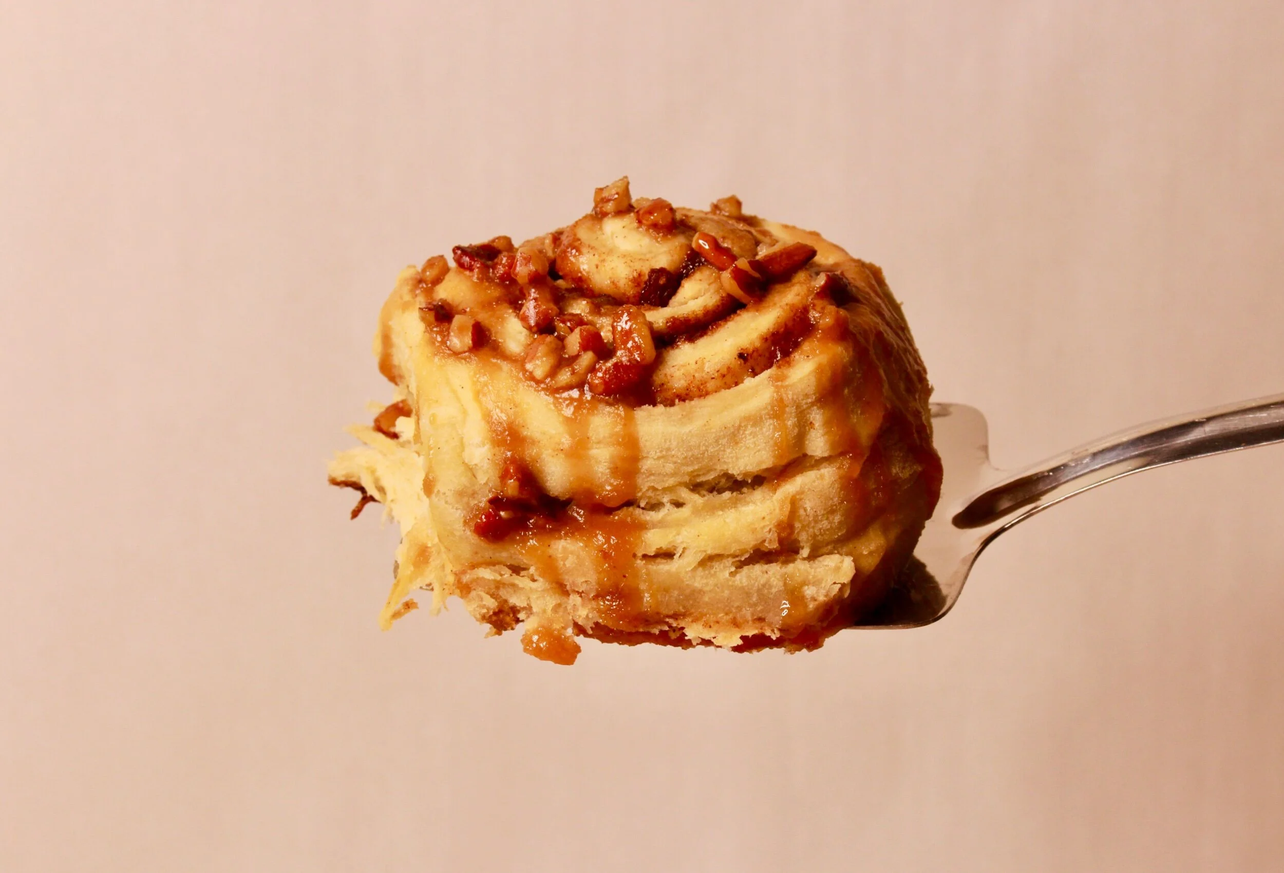 sweet roll made from scratch with pecans and raisin filling topped with praline pecan drizzle
