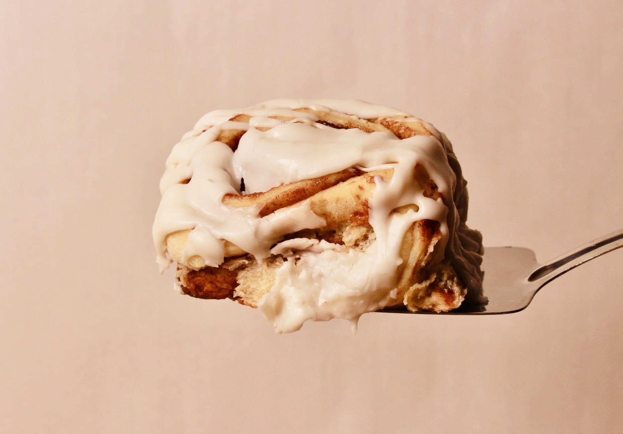 sweet roll from scratch with pumpkin filing topped with cream cheese icing